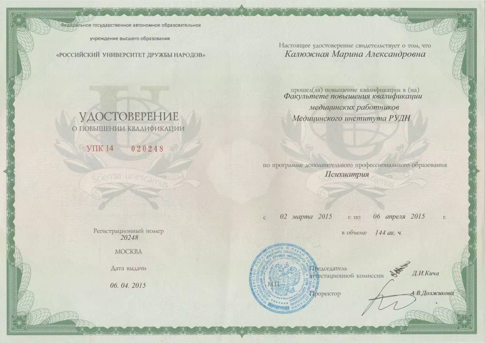 • 2015 — Российский университет дружбы народов (Повышение квалификации по программе "Психиатрия-наркология");